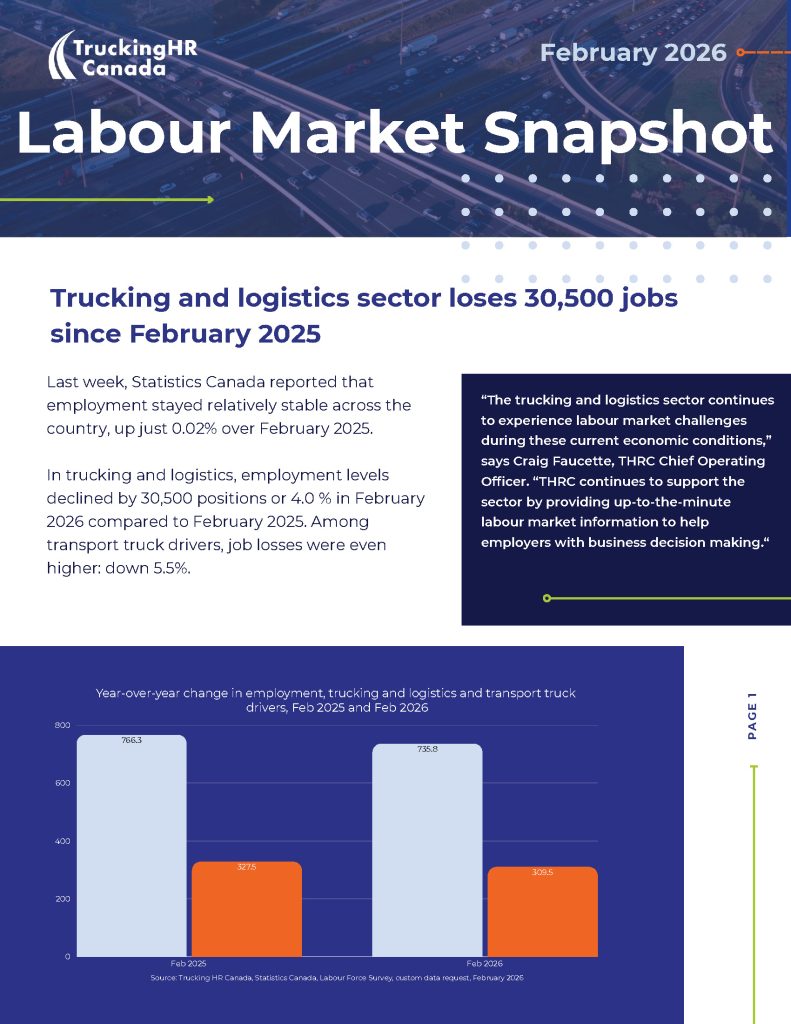 Ottawa, ON (March 23, 2026) — Recent data from Trucking HR Canada (THRC) shows that current economic conditions continue to have an impact on trucking and logistics. Employment levels in the sector declined by 30,500 positions or 4.0 % in February 2026 compared to February 2025. Among transport truck drivers, job losses were even higher: down […]