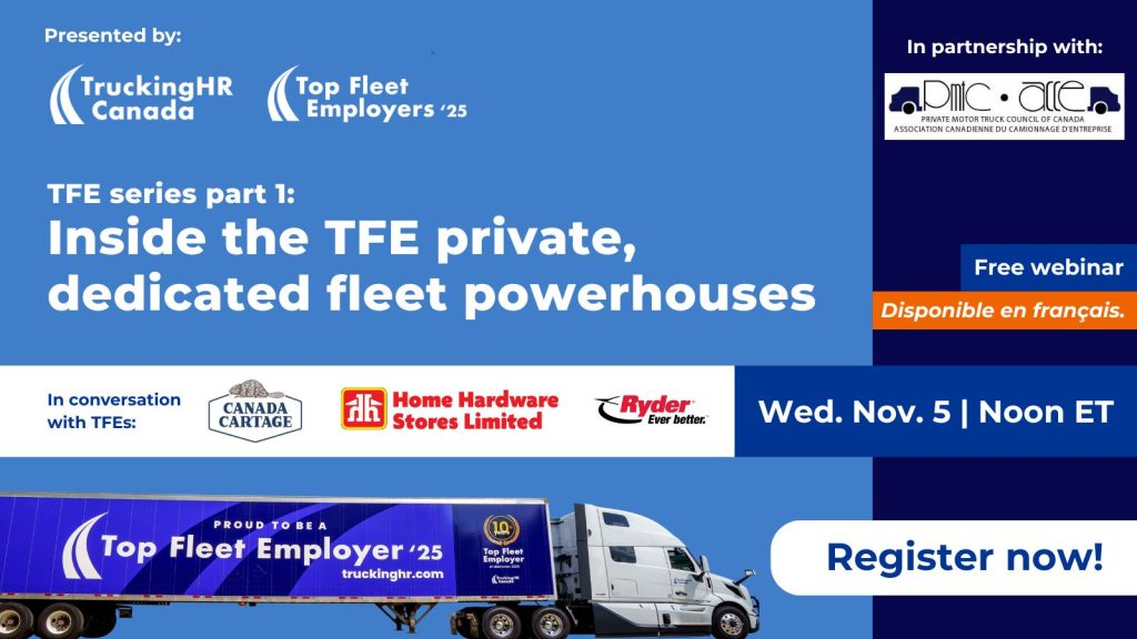 Presented in partnership with the Private Motor Truck Council of Canada (PMTC), this session includes executives from Canada Cartage, Home Hardware, and Ryder Canada. Learn what’s driving high retention in private and dedicated fleets, how they’re preparing for workforce shifts, and which best practices are transferable across the sector. Register now.
