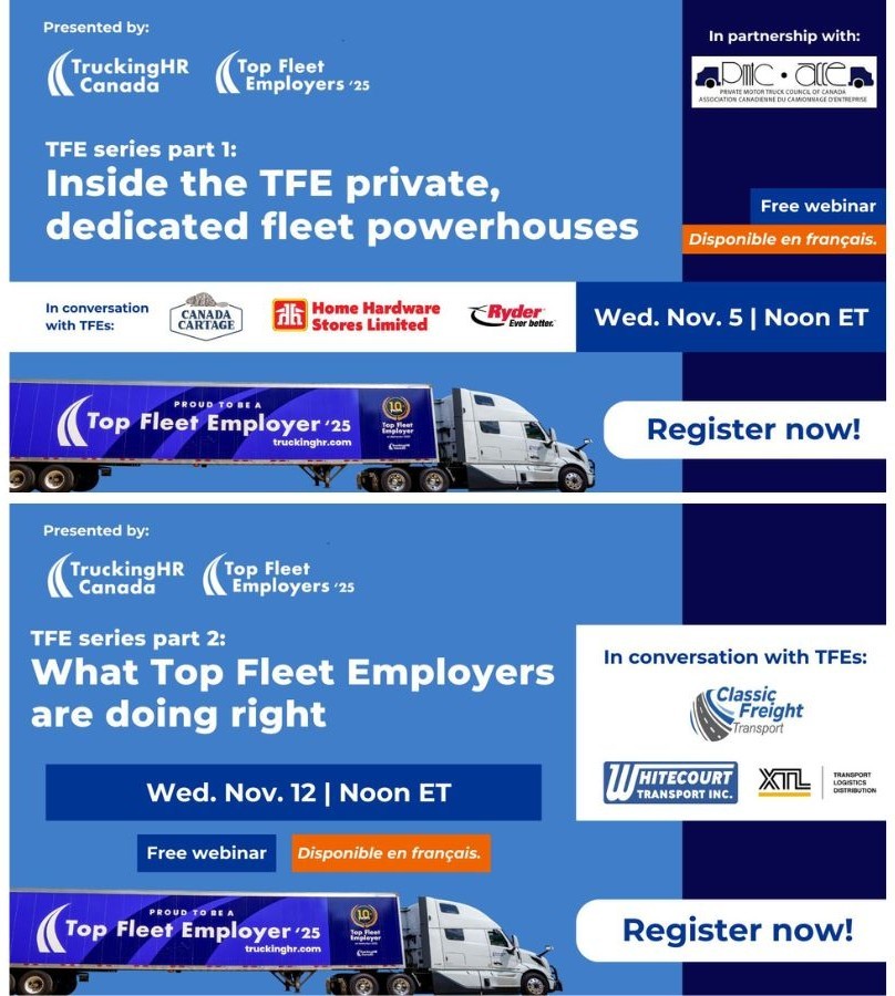 OTTAWA, ON (October 23, 2025) — Trucking HR Canada (THRC) is hosting two free webinars on November 5 and 12, spotlighting the latest trends and leading practices from the 2025 Top Fleet Employers (TFE) — with one session giving a special focus on the growing number of private and dedicated fleets earning the prestigious recognition.