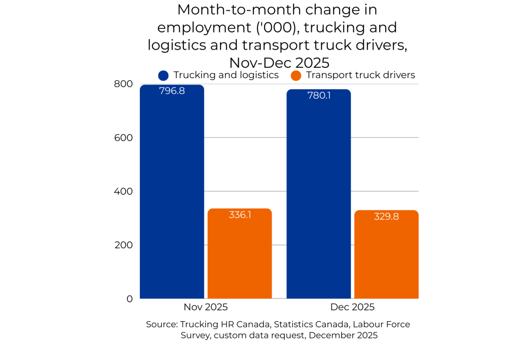 Ottawa, ON (January 28, 2026) — December employment in the trucking and logistics sector was down 16,700 jobs compared to November, and there were 6,300 fewer drivers employed, according to the latest data from Trucking HR Canada (THRC).