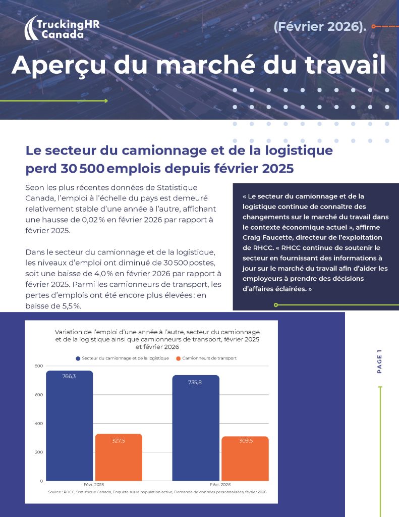 Ottawa (Ontario), le 24 mars 2026 — Des données récentes de RH Camionnage Canada (RHCC) montrent que les conditions économiques actuelles continuent d’avoir un impact sur le secteur du camionnage et de la logistique. Les niveaux d’emploi dans le secteur ont diminué de 30 500 postes, soit 4,0 %, en février 2026 comparativement à février 2025. Parmi les camionneurs […]