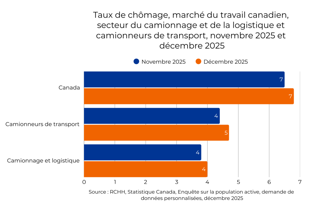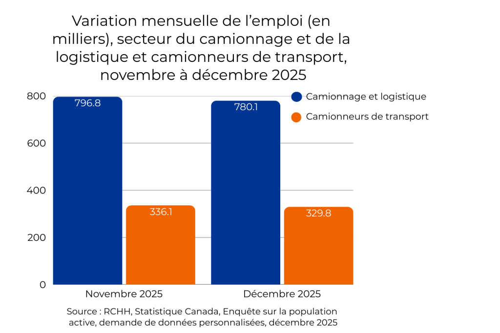 - Le secteur du camionnage et de la logistique a perdu 16 700 emplois entre novembre et décembre 2025, soit une baisse de 2,1 % d’un mois à l’autre.