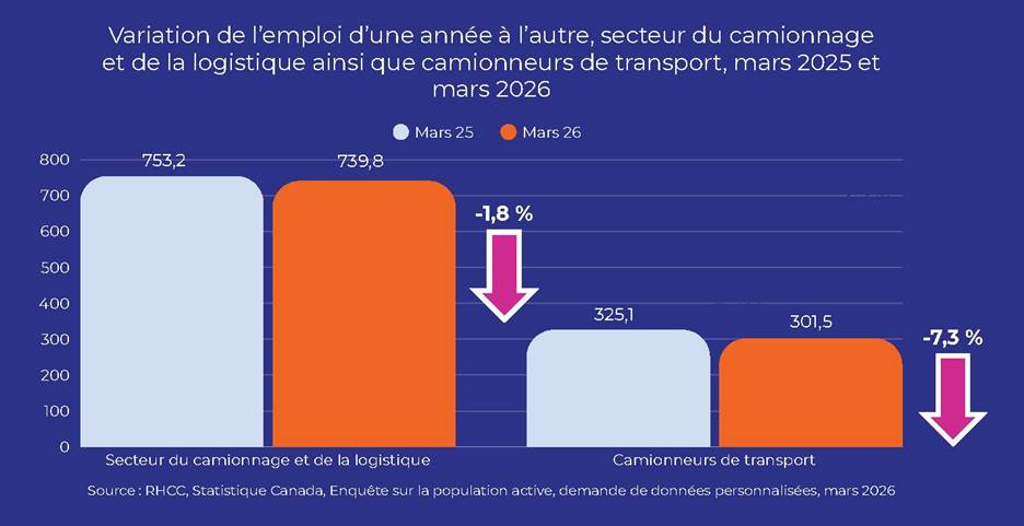 Ottawa (Ontario), le 28 avril 2026 — Selon de nouvelles données, le secteur canadien du camionnage et de la logistique employait 13 400 travailleurs de moins en mars 2026 qu’en mars 2025, soit une baisse de 1,8 %. L’emploi des camionneurs de transport a chuté de 7,3 % au cours de la même période, entraînant la perte de 23 600 emplois.