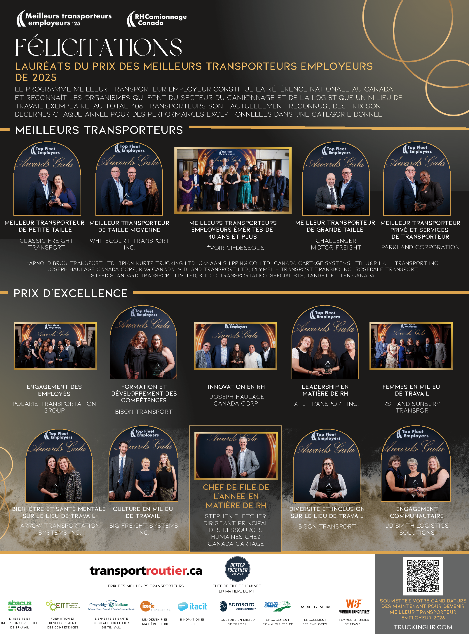 TFE is Canada’s national benchmark and recognition for organizations that make trucking and logistics a great place to work. A total of 108 fleets are currently recognized; awards are presented annually for exceptional category performance.