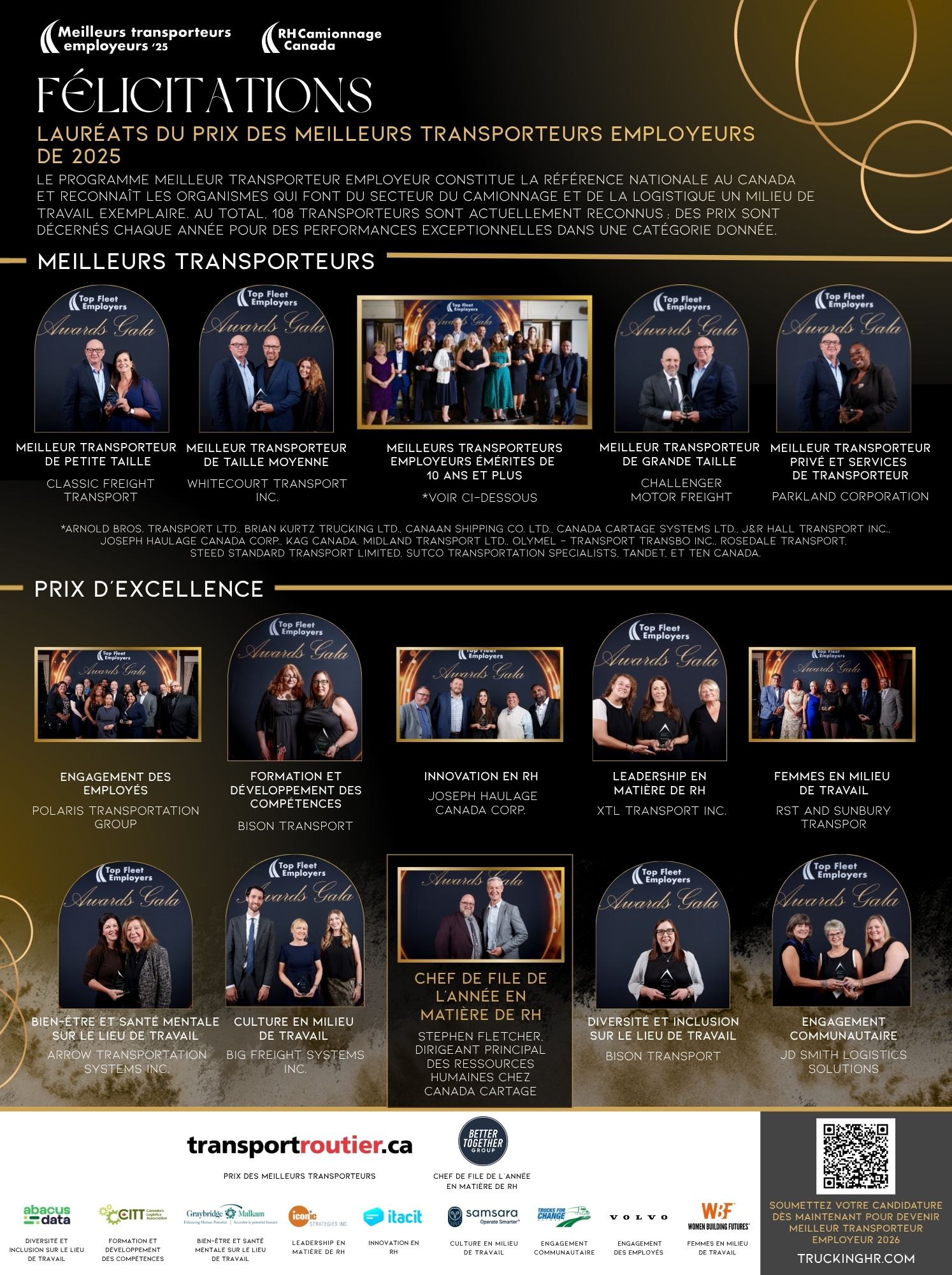 TFE is Canada’s national benchmark and recognition for organizations that make trucking and logistics a great place to work. A total of 108 fleets are currently recognized; awards are presented annually for exceptional category performance.